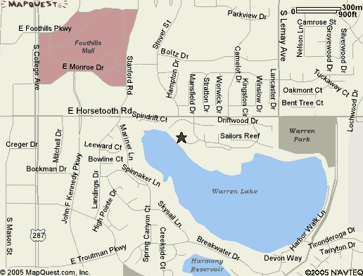 TIMBERLINE AND HORSETOOTH ROADS 1. Travel 1.3 miles West on Horsetooth Road through the two traffic lights for Lemay Ave. Turn left on North Star Course which is just 0.1 mile before the Stover traffic light. 2. Head south on North Star Course for 0.1 mile, up a small grade, and turn right on Sandpiper Point. 3. Head southwest on Sandpiper Point until the Cul-de-Sac forces a U-Turn. 713 is on the left [south] side of the Cul-de-Sac. |